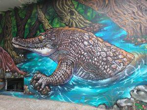 This mural depicts a gorilla, surrounded by dense tropical vegetation. In the background there is a swamp inhabited by birds. The mural’s contrasting colours imbue